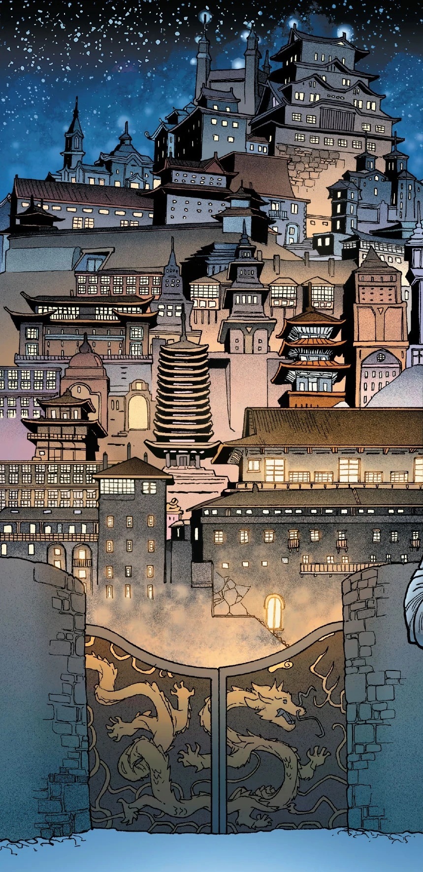 Их высота была с двадцатиэтажный дом. Сами ворота были сделаны в азиатском стиле. Высокая арка, с разными уступами и коньками или как там они назывались, со статуями драконов и каких-то птиц, вроде фениксов, из чего-то очень напоминавшего золото на крыше. Возможно, что это действительно было оно. Насколько он помнил, в Азии любили его использовать в отделке статуй и украшений. На створках были нанесены какие-то иероглифы… Но больше всего парня поражали сами ворота, которые были сделаны из дерева. Создавалось ощущение, что каждый брус был цельным, сделан из одного ствола дерева. Удивительное зрелище.
