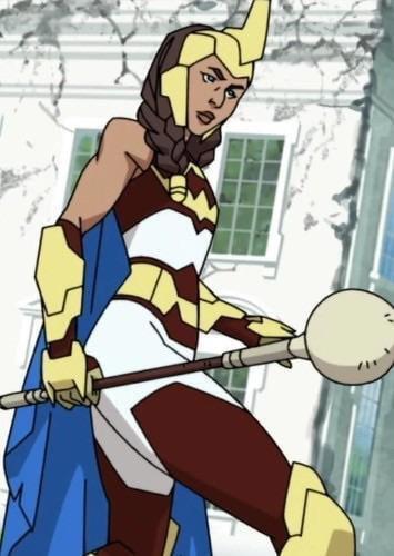 Героиня была одета в лёгкую броню из странного сочетания бурой и белой клёпаной кожи, при этом имея латунные шлем, перчатки и пояс, украшенные в греческом стиле. В своих руках она держала немаленькую булаву, сделанную из столь необычайного сверхплотного металла, что моя способность инстинктивно понимать свойство объектов и их атомарную структуру, чуть не сошла с ума.