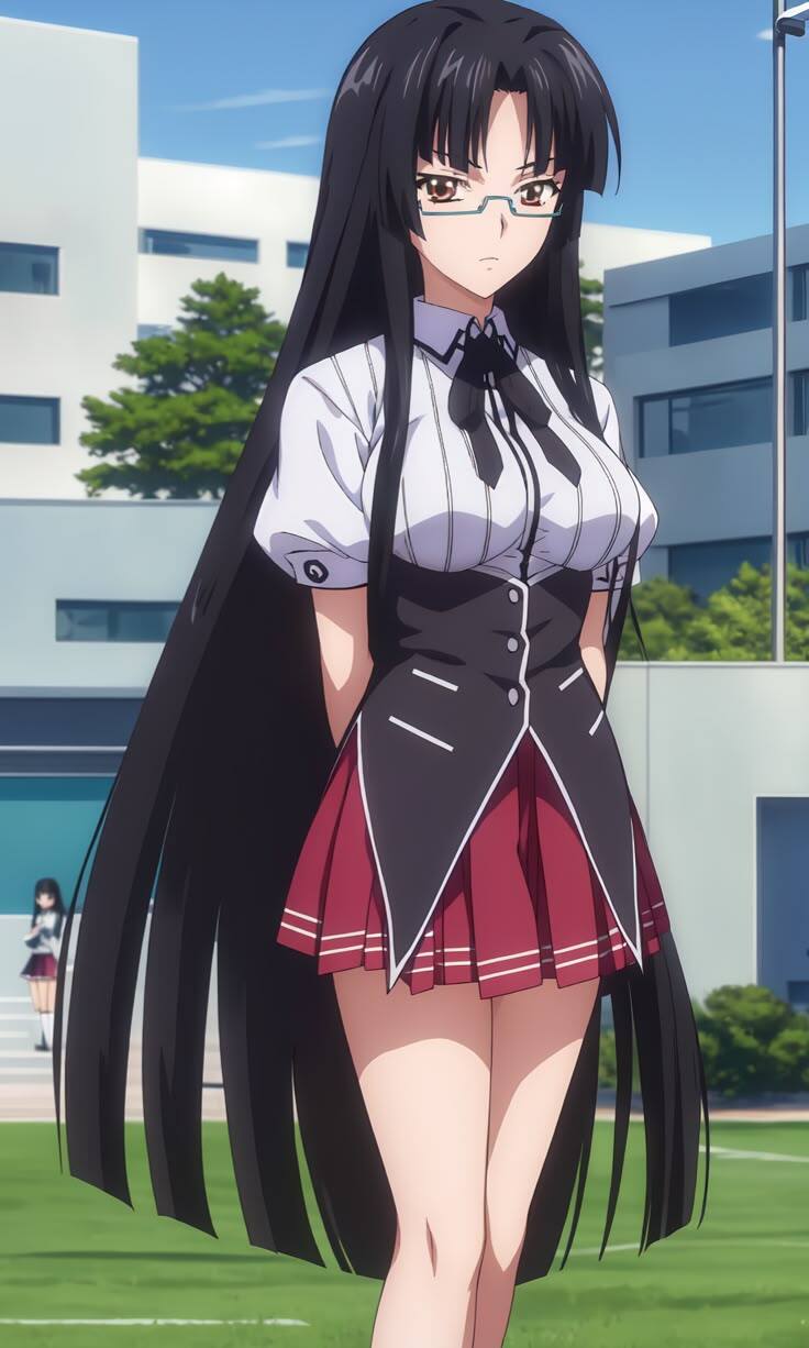 Следом за ней в комнату вошла Цубаки. Высокая девушка, с очень длинными черными волосами до колен. Выглядела она полной противоположностью Соны. Особенно в области попы и груди. Но всё же сходство у них было — очки и цвет глаз. Точнее у Цубаки только один глаз фиолетовый, а другой желтый.