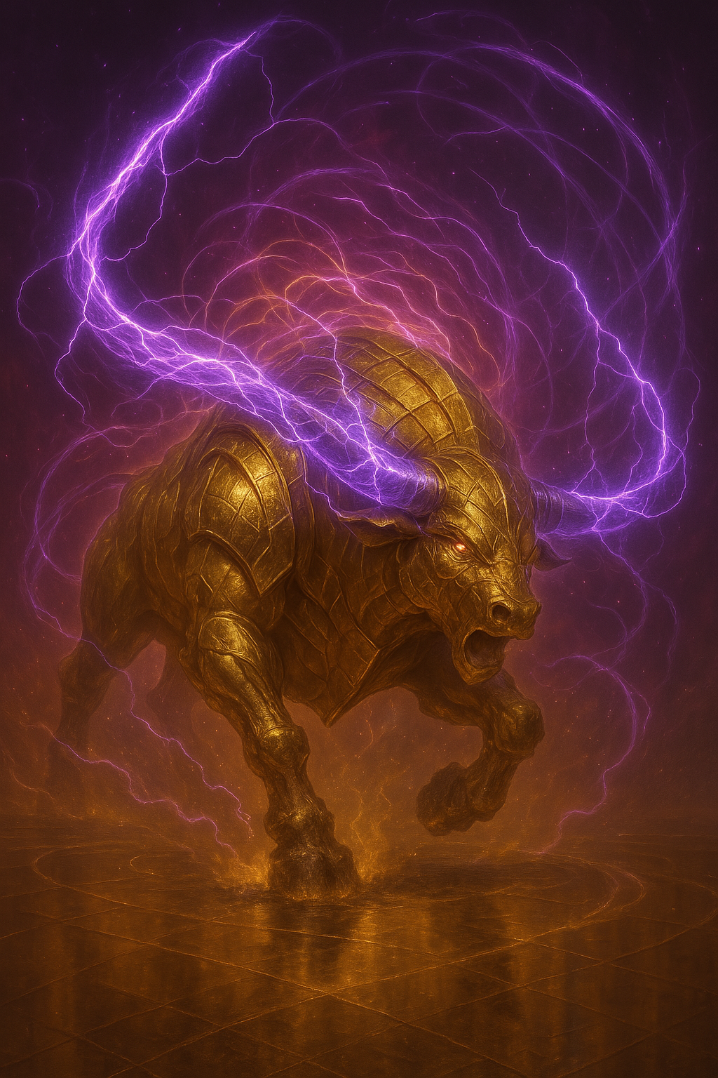На этот раз перед нами возник исполинский зверь, напоминающий быка. Его мощное тело было покрыто броней из золота, а по рогам пробегали молнии.