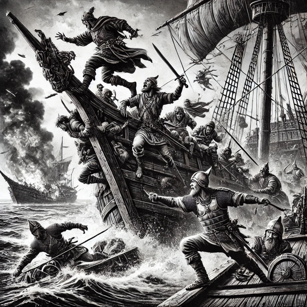 Из-за резкой смены курса, некоторые обходящие ладьи Виктариона подставились под таранные удары. Хруст дерева, крики тонущих и сгорающих заживо людей звуки рогов и грохот барабанов разнеслись над проливом.