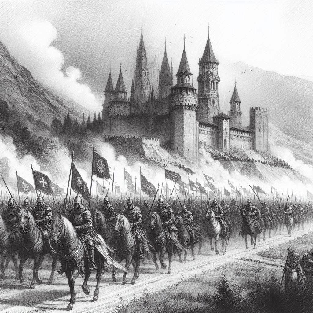 Золотая Дорога, широкая и ровная, петляла между холмами, теряясь в пыльном мареве знойного дня. Гулкий ритм копыт, скрип колёс обозов, звон металла и гул голосов создавали единый боевой хор, предвещая грядущую бурю. Колонна растянулась на многие лиги, словно река стали и золота, заполняя дорогу знамёнами и военной мощью.