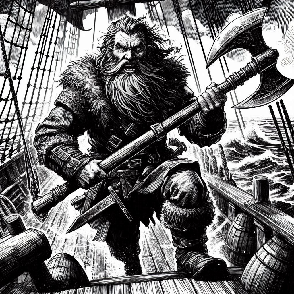Чёрная Бета содрогнулась, когда массивная боевая ладья железнорожденных врезалась в её борт, цепляясь абордажными крюками. Воины в «солёной» броне с грозными топорами и кривыми клинками перескакивали через поручни, как волки, прыгающие на добычу. Один из них, окровавленный и с жуткой ухмылкой, выдернул меч из груди упавшего моряка и тут же шагнул вперёд, разя следующего.