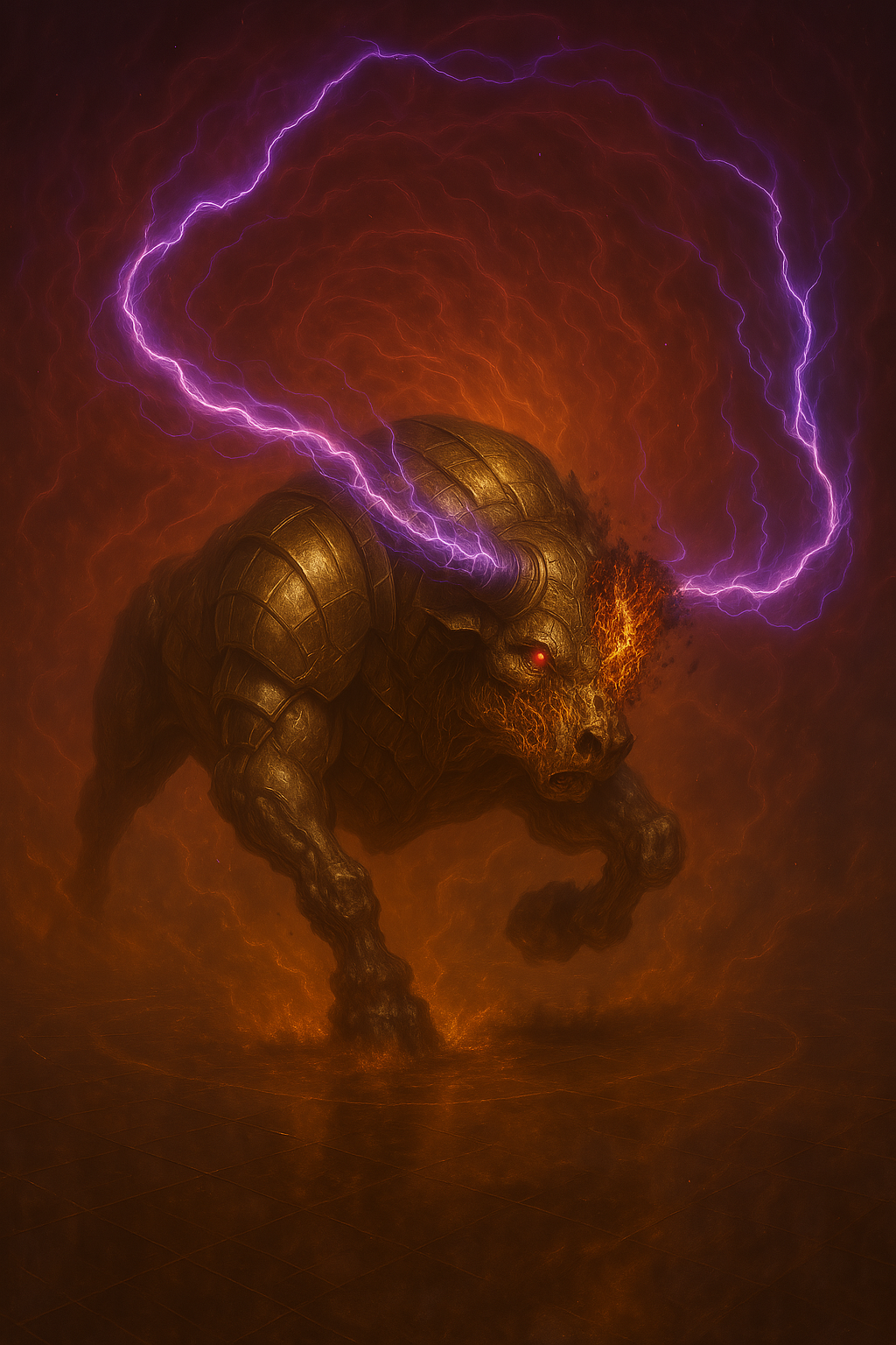 Спустя мгновение массивная фигура появилась перед нами. Его глаза засверкали, а на рогах заиграли электрические разряды. Он заревел, потрясая головой.