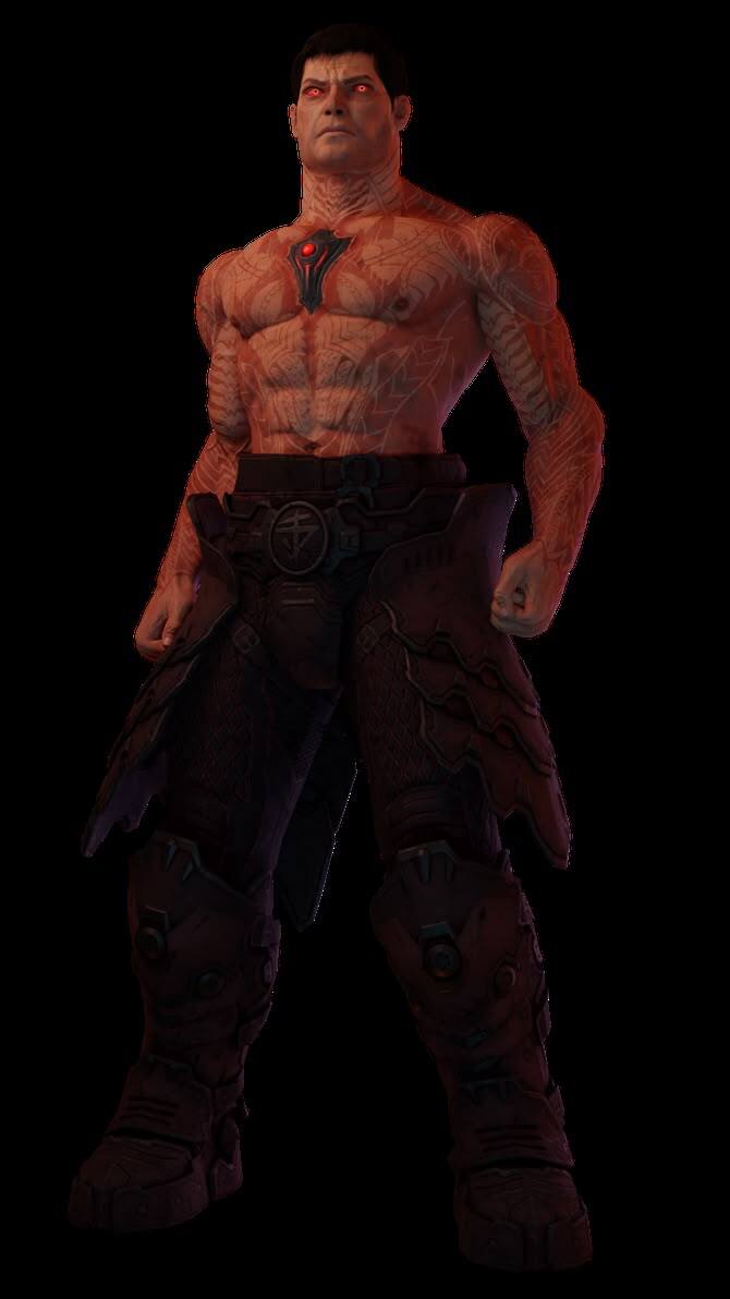 Выглядело оно как высокий мужчина-брюнет, с прямоугольным, суровым лицом, светло-красными белками и тёмно-красными радужками глаз. Существо, ощущаемое как нечто демоническое, было обнажено до пояса, демонстрируя вид на шрамирование и красные нечестивые татуировки, покрывающие могучие мышцы. Ноги же закрывали тяжёлые, латные доспехи, цвета непроглядной ночи.