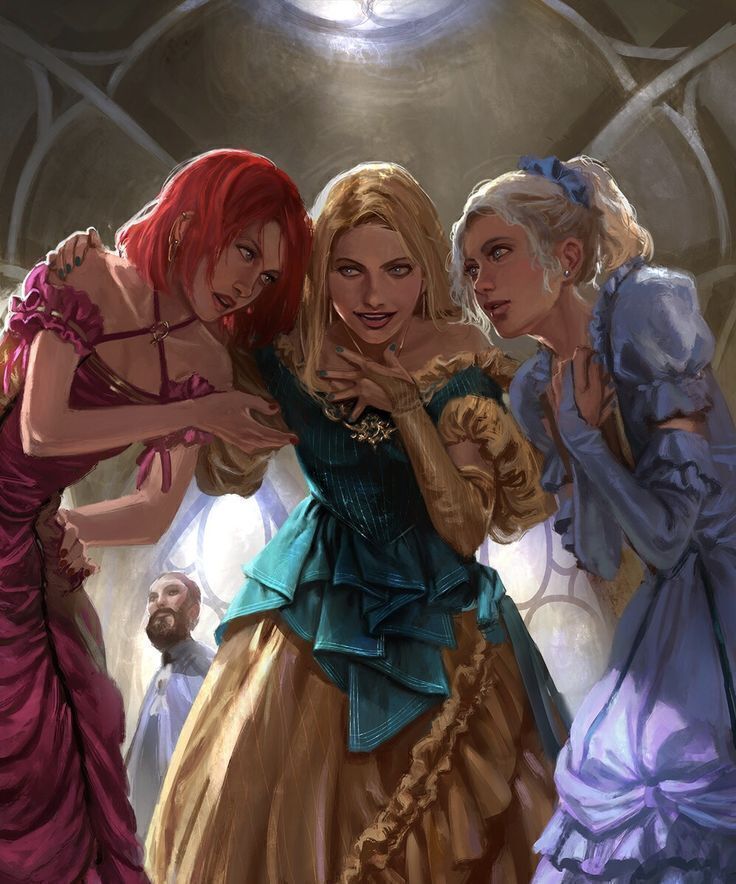 Сейчас, замечаю, как девушка уходит от семьи и через какое-то время вклинивается в группку фрейлин королевы, начиная о чём-то с ними переговариваться и хихикать.
