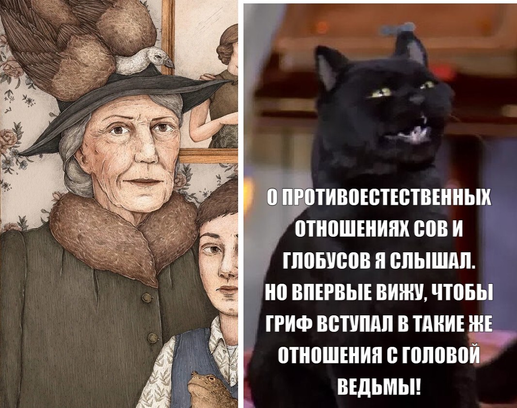 — О противоестественных отношениях сов и глобусов мне доводилось слышать, но я впервые вижу, чтобы гриф вступал в такие же отношения с головой ведьмы!