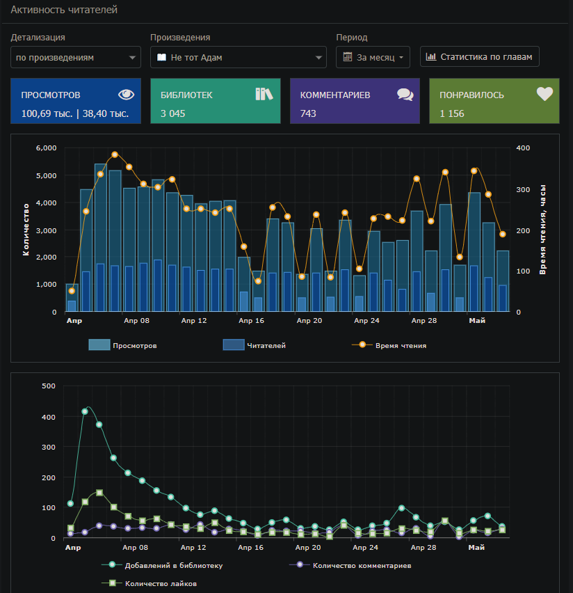 Откровенно говоря, активности стало поменьше. Это видно по графику (который я прикрепил). В целом — результат всё равно отличный, и я невероятно благодарен каждому, кто остаётся со мной. Но не буду врать — видеть такой резкий скачок в начале и потом спад довольно неприятно. Стараюсь не терять мотивацию. И ваши комментарии в этом очень помогают. Спасибо вам за каждое тёплое слово.