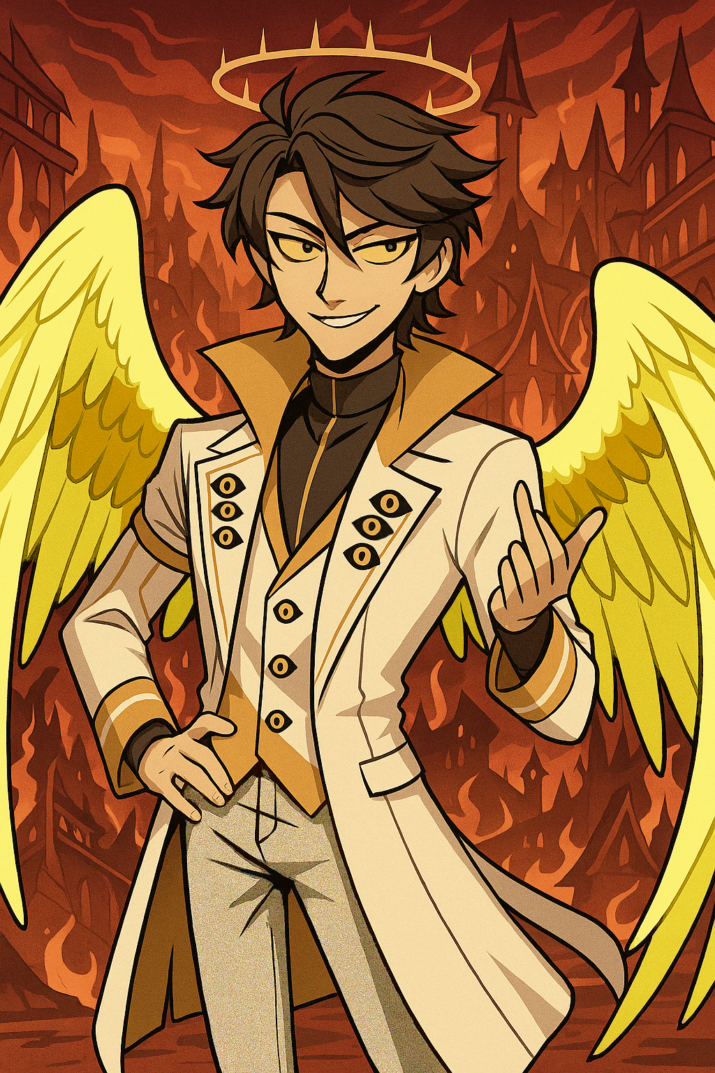 Основу моего нового наряда составляла ослепительно-белая мантия из какого-то плотного, но невероятно лёгкого материала, похожего на шёлк. Строгий, почти военный покрой: длинные рукава, высокий воротник-стойка, прямой силуэт. Широкие белые лацканы мантии были расшиты сложным, переливающимся узором и несли на себе по три стилизованных глаза с ярко-жёлтыми вертикальными зрачками — по три на каждом лацкане. Да, в Раю определённо был какой-то странный фетиш на глаза. Под мантией — угольно-чёрная шёлковая рубашка из тончайшей, но прочной ткани, тоже с высоким воротником. Контраст абсолютно чёрного и ослепительно белого выглядел невероятно стильно и строго, по крайней мере, мне нравилось. Рубашка была украшена лишь тонкими золотыми линиями, идущими вертикально по центру и очерчивающими воротник, где на горле красовался небольшой золотой крест. Рукава мантии были широкими, свободными, и завершались массивными золотыми наручами-манжетами с острыми, зубчатыми краями, украшенными сложным орнаментом, напоминающим то ли какие-то древние руны, то ли ещё какую-нибудь неведомую хрень. Выглядело довольно агрессивно и внушительно. Завершал образ широкий золотой пояс с массивной пряжкой в виде стилизованной, остроконечной буквы «А», которую так любил Адам и идеально подогнанные белые брюки с тонкими золотыми лампасами, заправленные в высокие белые сапоги с золотой отделкой.