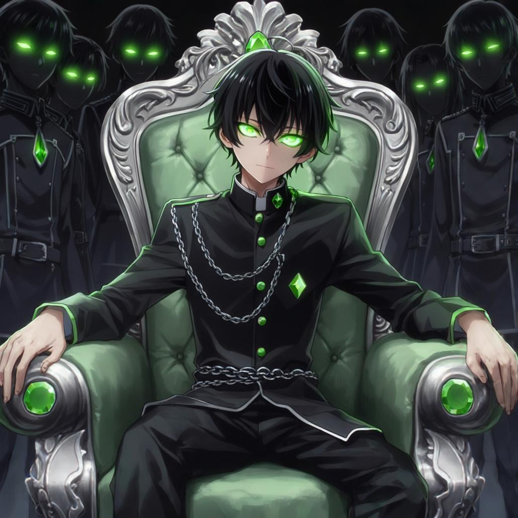 Это был огромный тронный зал, вырубленный в скале под руинами города. Посреди зала на массивном троне из чёрного обсидиана восседал он. Тот самый высокий мужчина с иссиня-чёрными волосами до плеч и пронзительными, холодными зелёными глазами, в которых не было ничего человеческого — лишь чистая сила и бесконечная, усталая ненависть ко всему живому. Он был одет всё в ту же строгую чёрную форму с серебром и зелёными драгоценными камнями, идеально чистую, без единой пылинки, что так контрастировало с окружающей разрухой. Его руки спокойно лежали на подлокотниках трона. Он ждал меня.
