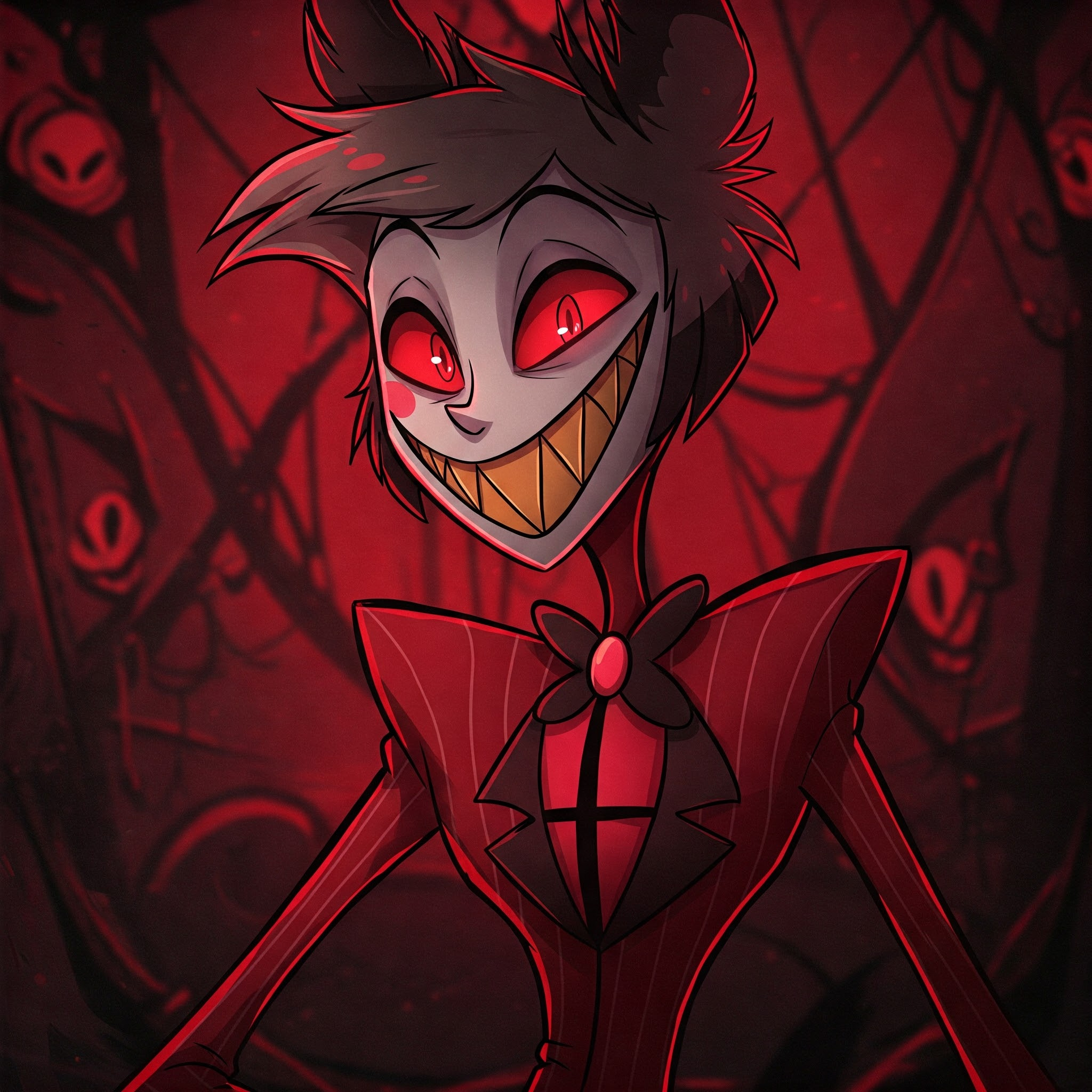 — Баал? Какое прелестное, звучное имя! — Аластор изящно склонил голову, его улыбка стала ещё шире, почти гротескной, но глаза смотрели холодно и проницательно, сканируя меня. — Рад приветствовать вас в нашем скромном, но полном энтузиазма заведении, дорогой Баал! Я Аластор, местный… скажем так, помощник по хозяйству и иногда радиоведущий. Приятно познакомиться! — он протянул мне свою тонкую, бледную руку с когтями. Я ответил на рукопожатие, чувствуя исходящий от него холод. — Скажите, что же привело столь… уникальное существо в наше пропащее место? Уж точно не поиск искупления, смею предположить? Ха-ха-ха! — его смех звучал как помехи на старой пластинке.