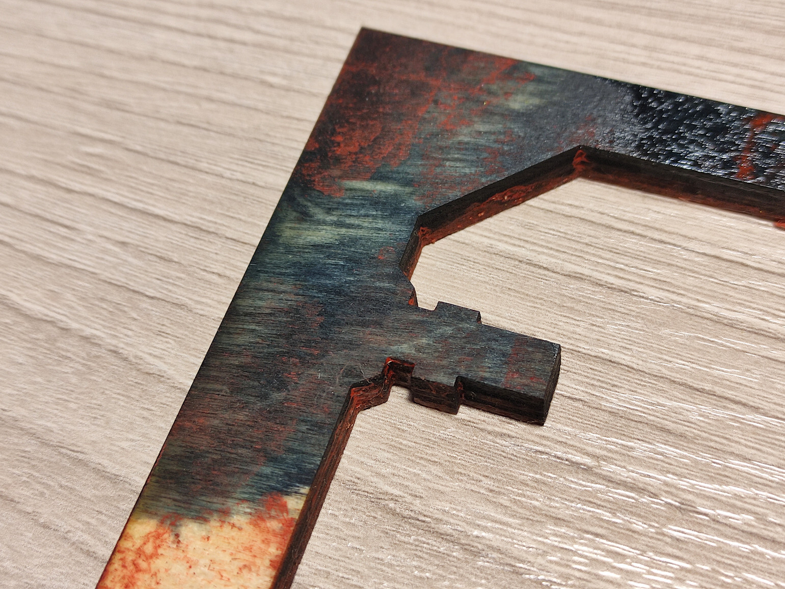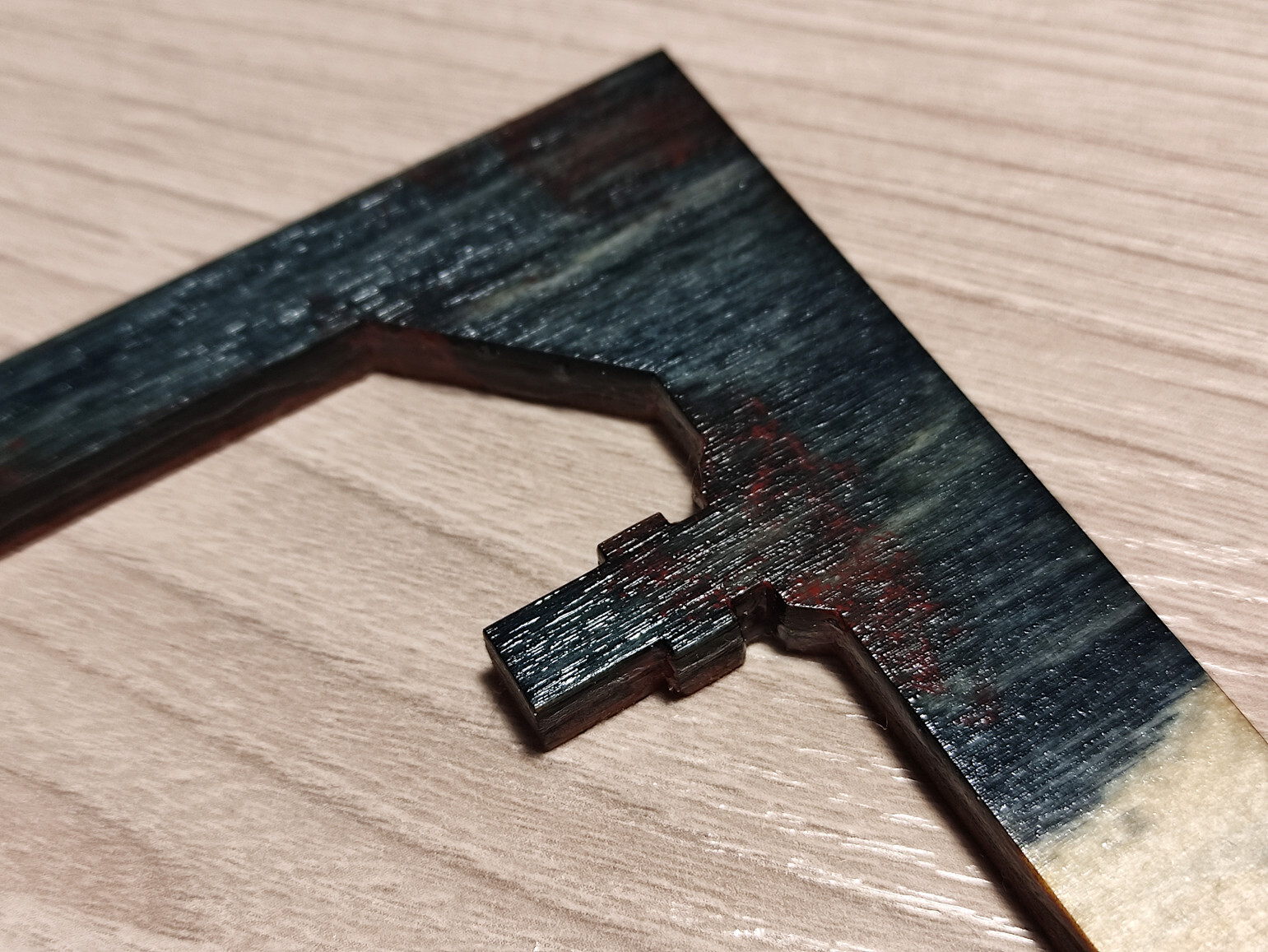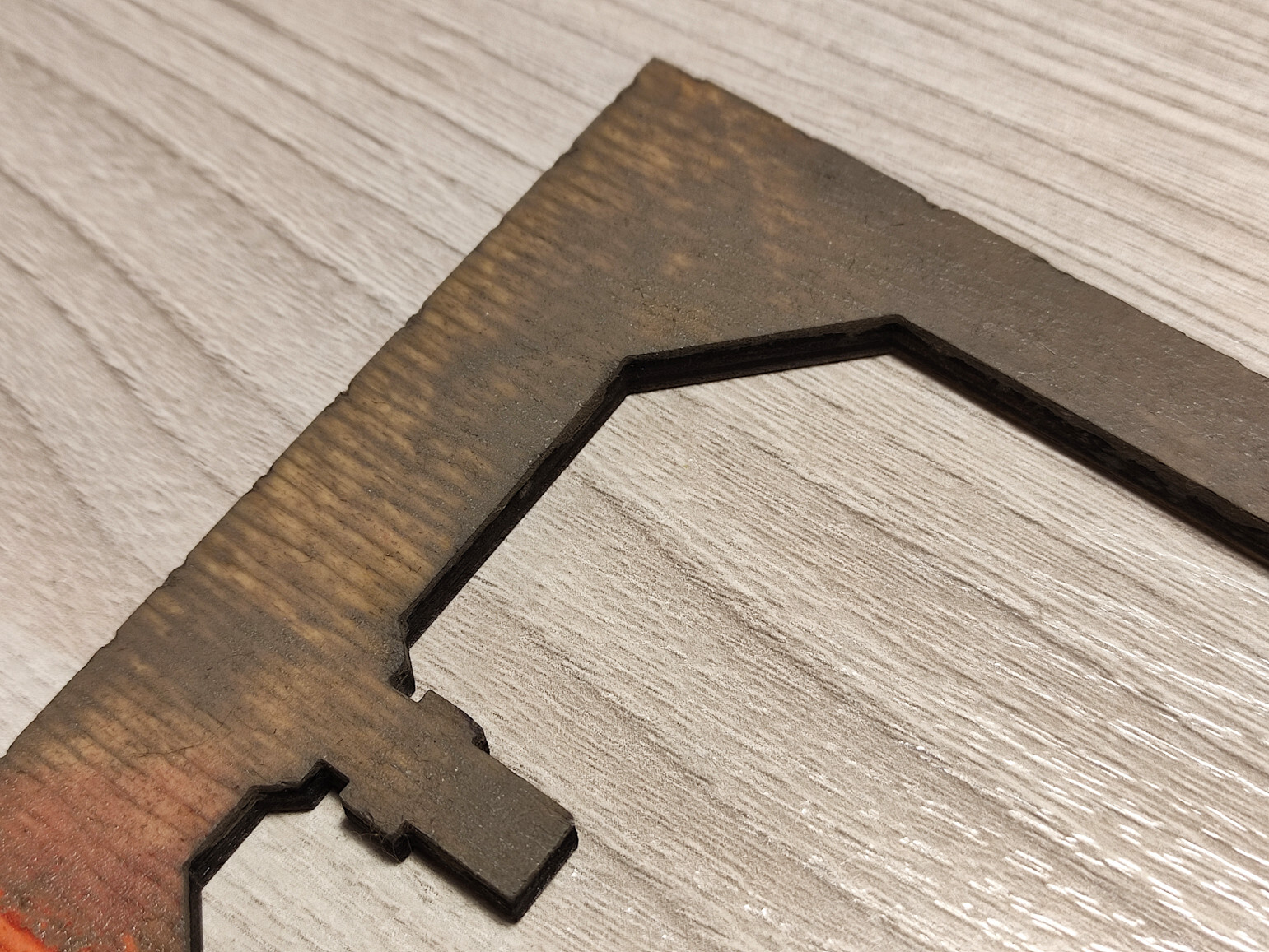 Потом отгравировал логотипчик. К сожалению, фокусировка вышла не очень точной — этот процесс определённо требует наладки. мелкие детали размылись, но в целом смотрится более-менее.