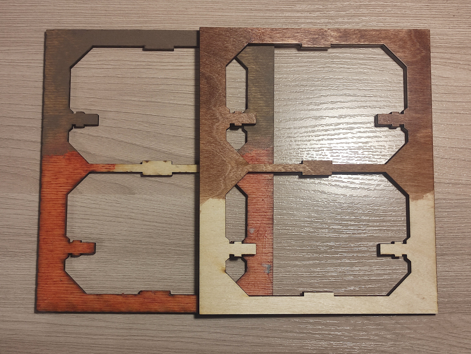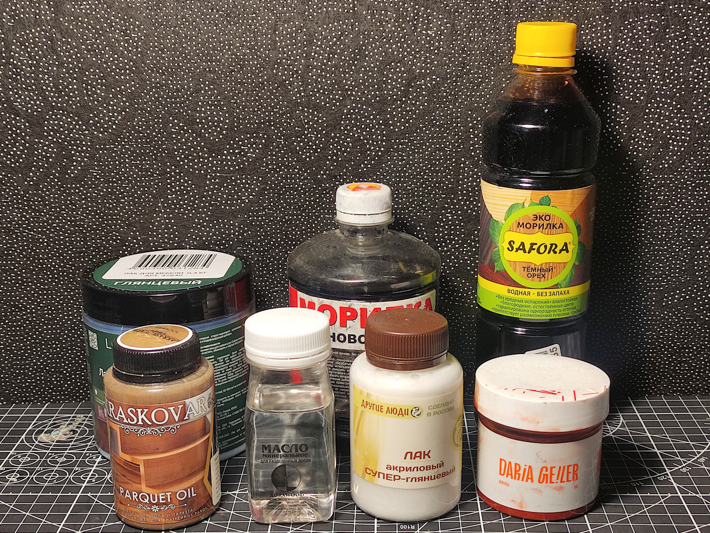 В итоге я решил обратиться к проверенному варианту: морилка плюс лак. Морилка у меня в наличии была только цвета «эбеновое дерево», очень красивая, но почти чёрная, а так как я планировал делать лазерную гравировку, её просто не было бы видно.