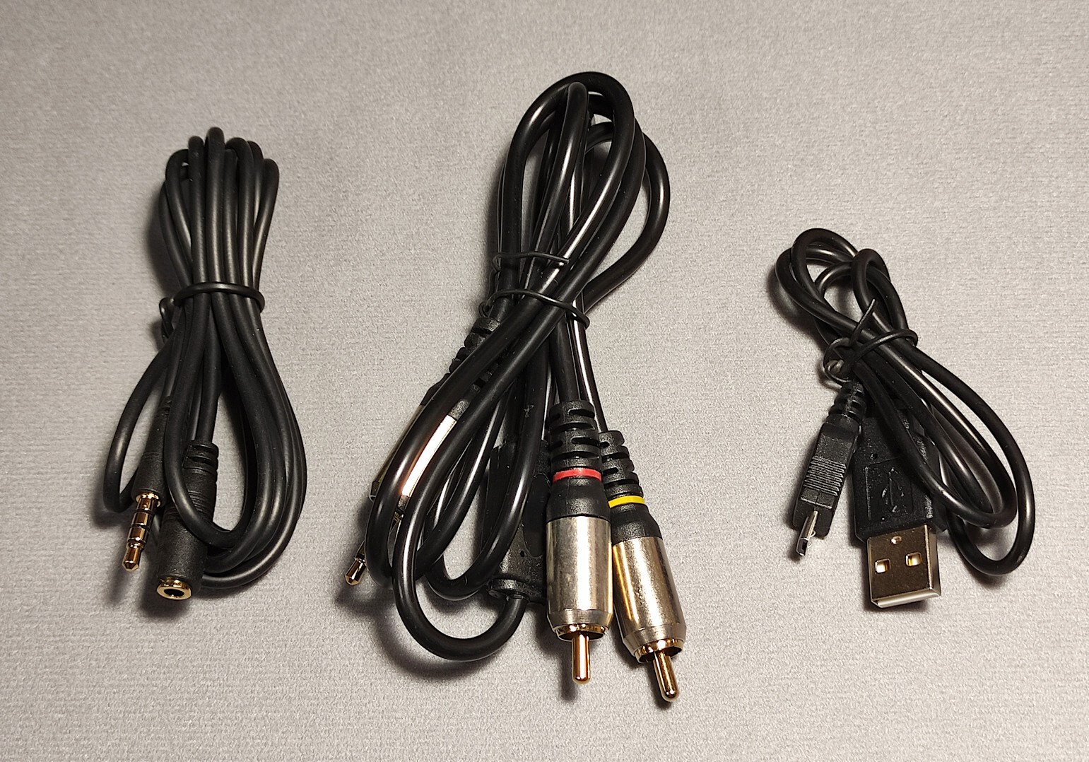 Пока же для всех трёх проектов мне нужен одинаковый провод для подключения питания и телевизора. Я решил сделать один на всех. Закупил для этого составляющие: провод удлинителя 4-пинового Mini-Jack (для наушников с микрофоном), провод Jack-2xRCA, и четыре 4-пиновых гнёзда Mini-Jack под гайку. Также в закромах нашёл ненужный USB-провод питания, без линий данных, как раз под такое дело.