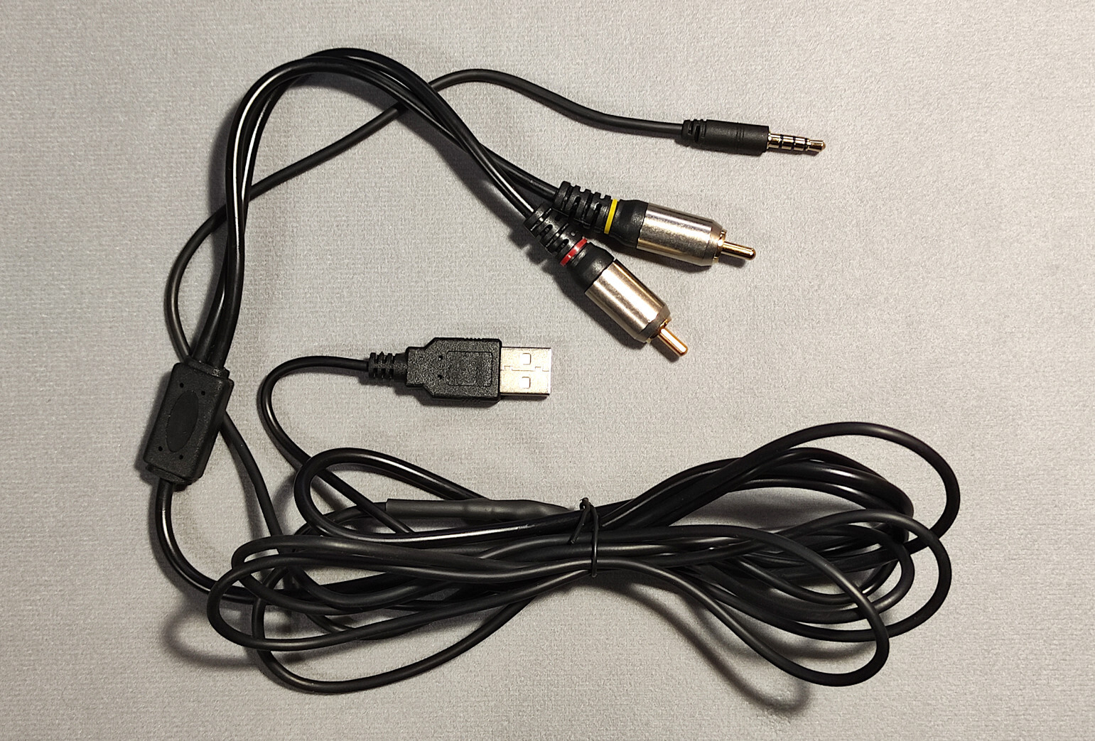 Всё это обрезал, спаял, и закрыл место соединения термоусадкой. Получился длинный провод с разъёмом Mini-Jack на одном конце, а другой конец разветвляется на два отрезка покороче: USB для питания от адаптера или пауэр-банка (предпочитаю этот способ), и RCA для подключения к телевизору.