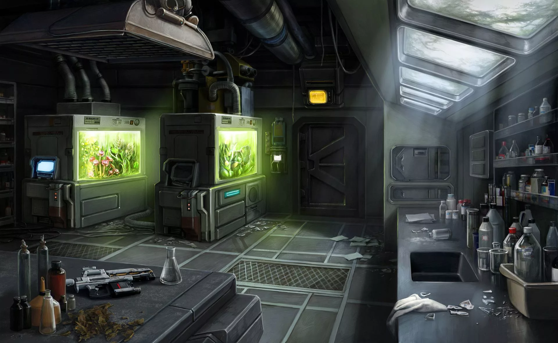 Наконец приземлившись на верх лифта, вырываю крышку и пролезаю внутрь, откуда уже выхожу к конечному пункту своего назначения. Ничего себе тут обустроено. Это же ещё одна лаборатория. Хотя по нескольким слоям пыли видно, что сюда уже давно никто не заглядывал.