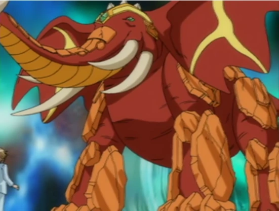 На поле появился один из самых массивных моих бакуганов. Его сила составляет триста пятьдесят очков. Выглядит он как слон, но с двумя парами бивней по бокам от хобота и в нескольких местах покрыт бронепластинами.