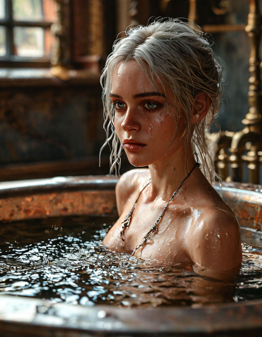 Изящно перекинув ножку через борт, Цири замерла на миг и с удовольствием потянулась, позволяя мне ещё раз рассмотреть её ладную фигурку. Бледные вишенки сосков, набухших от возбуждения, так и манили взор, но девушка, дразнясь, в притворном стеснении прикрыла грудь рукой, едва поймав мой хищный взгляд. Сев на дубовую решетку на дне ванной прямо передо мной, эта плутовка раздвинула колени и маняще улыбнулась. Однако едва я потянулся к ней, как она сама в одно движение переместилась мне на колени, пустив маленькую волну между нами. В следующий миг Цири жадно впилась в мои губы, а я, уже зная каков следующий шаг… через силу остановил её.