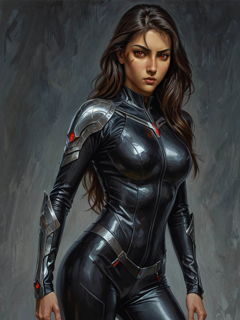 …затянутая в некий облегающий тёмный костюм с элементами бронирования на руках и плечах, волнистые и блестящие каштановые волосы, ниспадающие чуть ниже середины спины, а также очень такое приятное лицо со смуглой кожей, прямым носиком, аккуратными губами и парой кроваво-алых глаз, под которыми на отсрых скулах имелась парочка неких красных отметок — типа чёрточек, без понятия, что символизирующих. Как-то не интересовался особо этой чисто султанатовской темой.