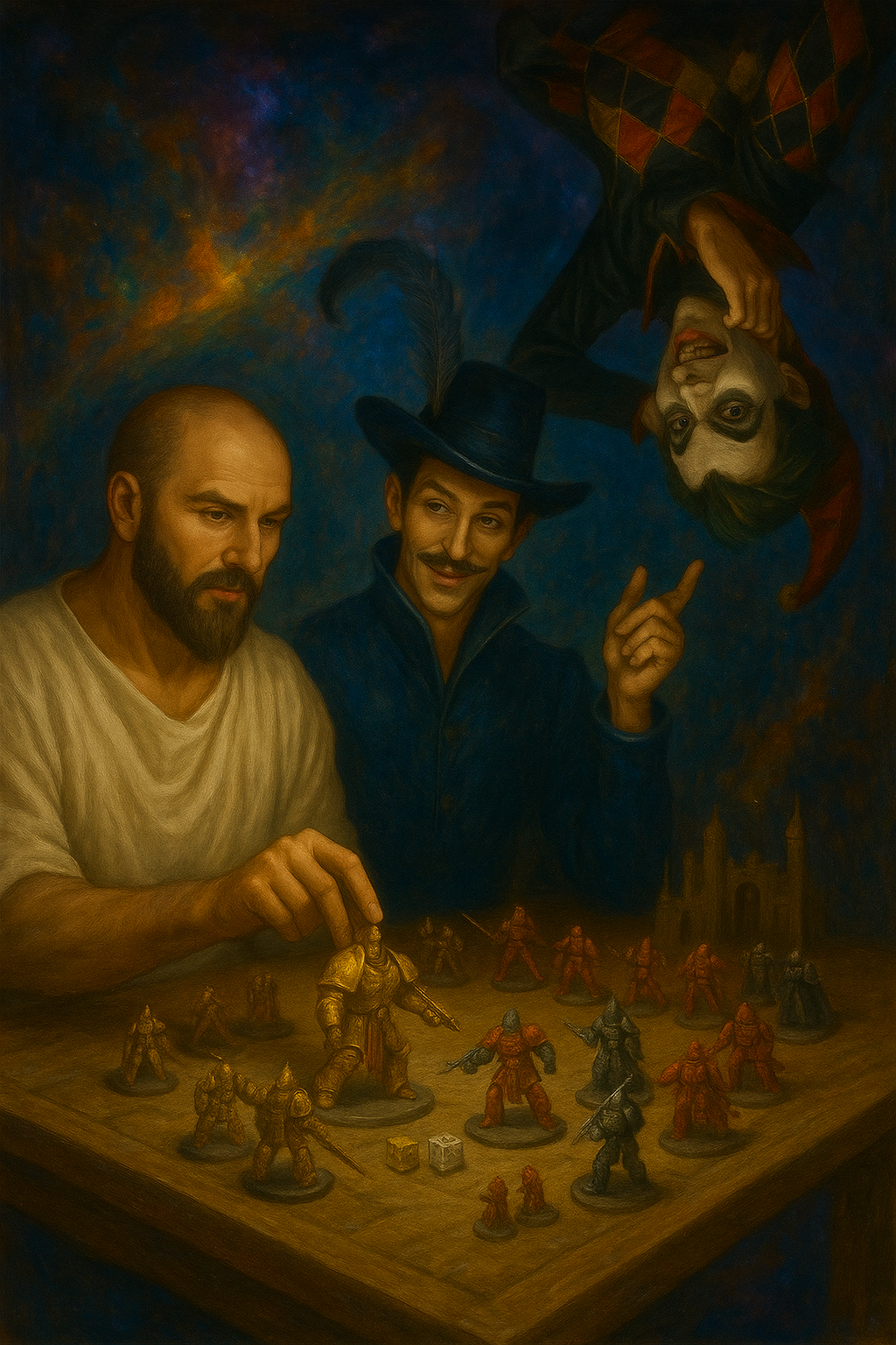 Всё абсолютно там же, где и всегда, в божественной сычевальне Тзинча, шла напряжённая игра. Неот, Цехорах и сам Тзинч втроём увлечённо резались в настольную игру под названием Warhammer 40000. Неот собрал себе армию Кустодиев, и даже скрупулёзно всё загрунтовал, покрасил и самолично, кисточкой (можно было и псионикой, но ощущения не те), покрыл золотом. Каждая из них — шедевр. Армия Тзинча представляла из себя солянку Тысячников, демонов и всякой прочей фигни. Бог Знаний особенно не запаривался нормальным покрасом, больше уделяя внимания концептуальности фигур. А Цегорах, разумеется, играл за Арлекинов, которых он прямо на ходу красил, и выставлял на поле боя, вися вниз головой.