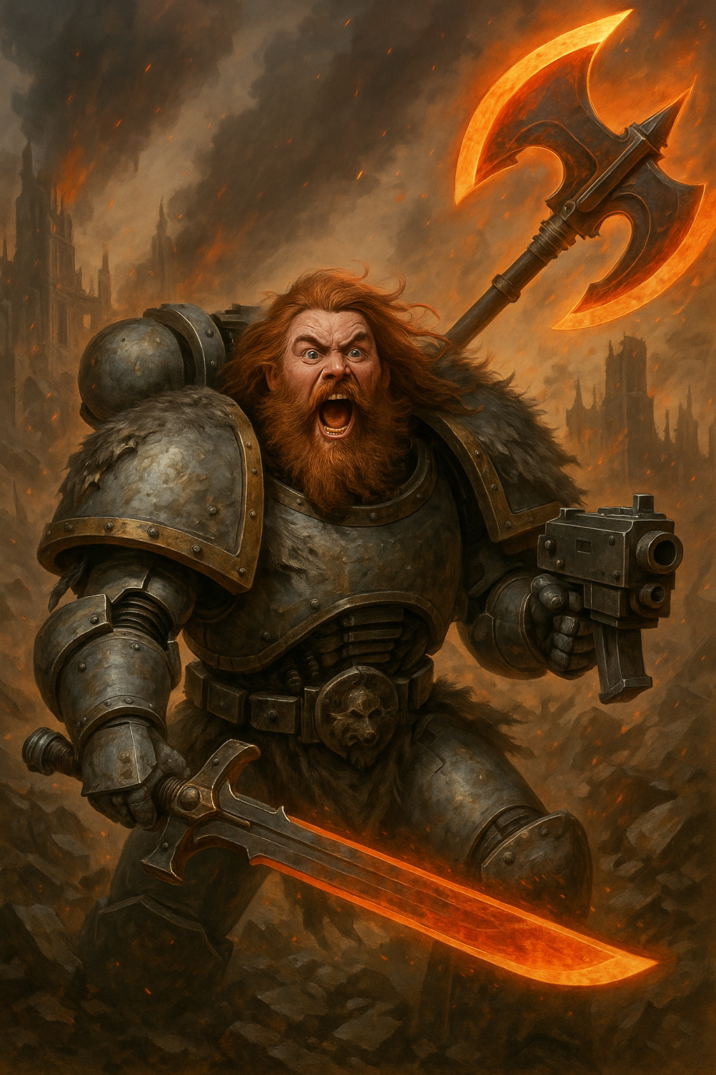 — Блять, — только и смог сказать техник, когда в отсек с десантными капсулами вломился, а по-другому и не скажешь, космодесантник. Ну подумаешь — десантник и десантник. Что их, мало, что ли? в том и дело, что ТАКИХ — точно больше нет. Первое, что бросается в глаза при взгляде на него — это терминаторский доспех. Демоны его знают, где он умудрился достать работающий терминаторский доспех, если их в армии В ПРИНЦИПЕ НЕТ, за ненадобностью. Поверх доспеха у него была накинута обычная, казалось бы, для десантников Космических Волков волчья шкура, но это только на первый взгляд. То была шкура громового волка, а это не два пальца обоссать. За спиной на специальном креплении виднелась силовая секира, редкий гость. Обычно ведь мечи или топоры, а тут секира. В руке, помимо болтера, он держал и силовой меч.