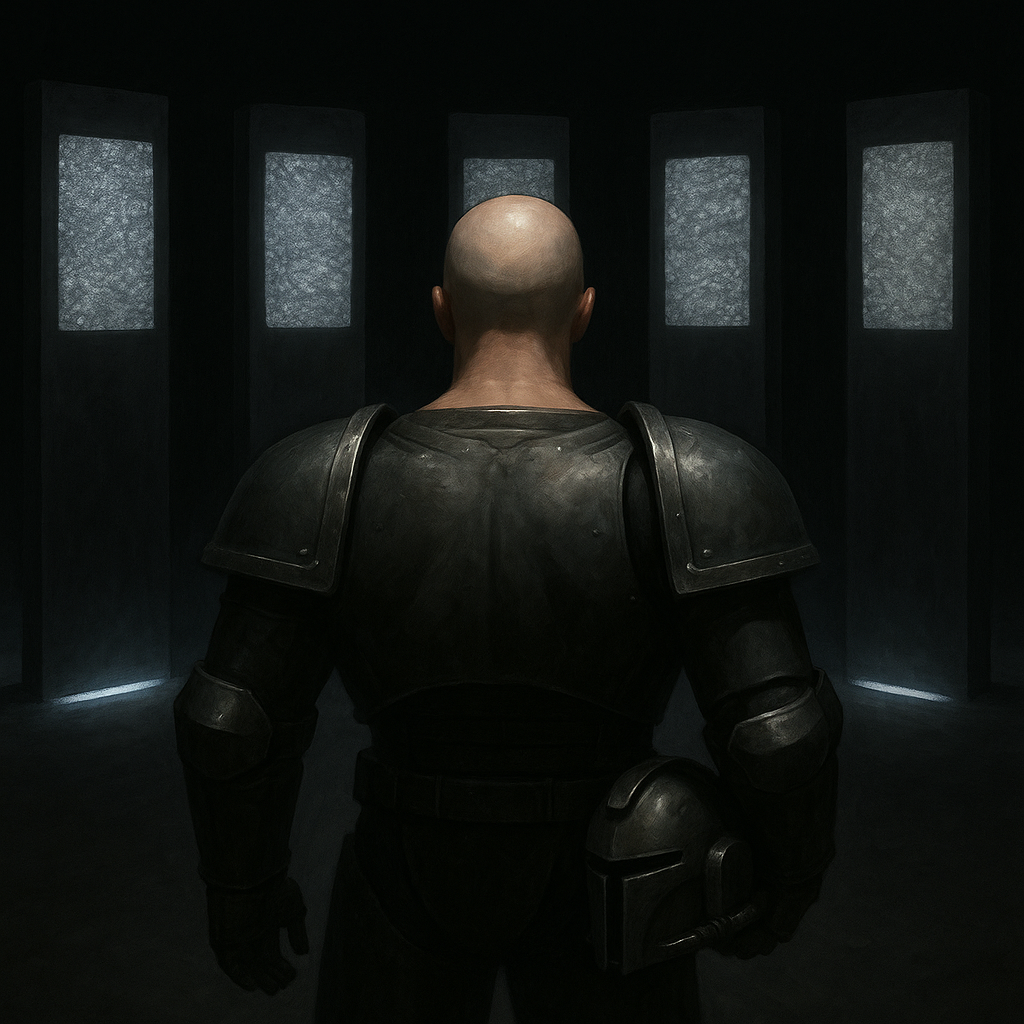 Специально для Альфария на полу подсвечивалась небольшая пульсирующая линия, которая привела его к огромным воротам. Когда он подъехал, они не открылись, а потому он встал и встал перед ними. Только тогда створки пришли в движение. После светлого помещения ангара он попал в тёмное, но благодаря встроенным в шлем системам, он видел всё как днём. Здесь не было никого, только десяток экранов на каменных столбах.