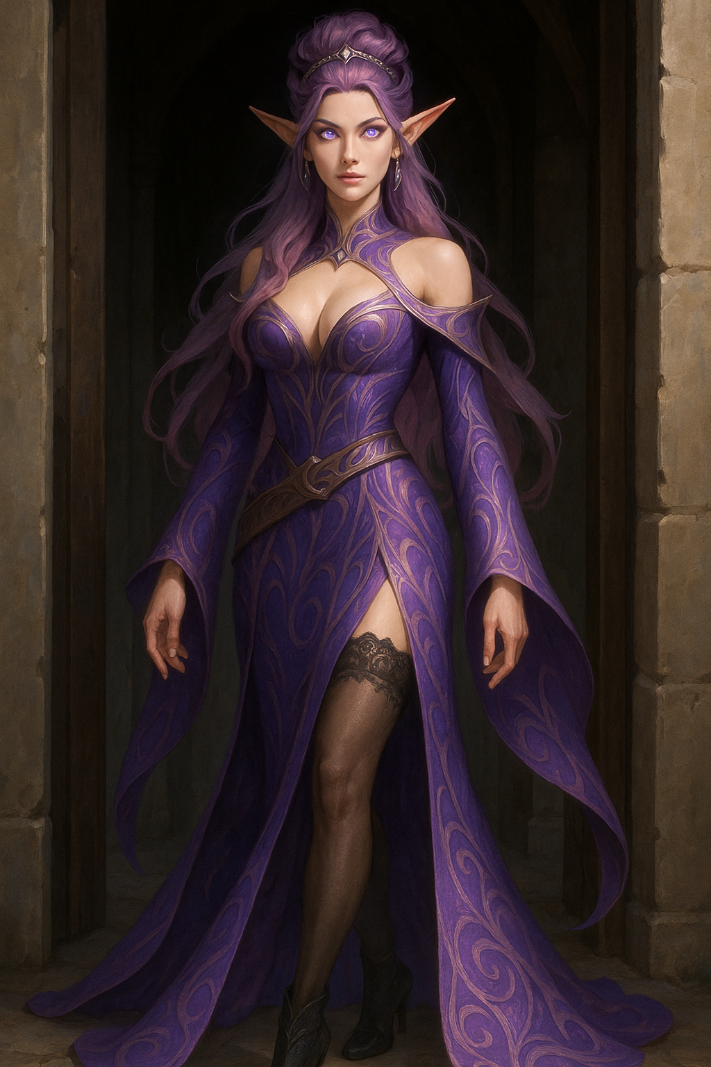 И понять этих нердов было можно. В дверях стояла ослепительной красоты женщина, даже девушка, с длинными волосами, собранными в затейливую причёску, поддерживаемую серебряным венцом, переливающиеся от нежно-розового до глубоко-фиолетового. Фиолетовое платье длиной в пол, но с такими разрезами, что при первом же шаге показалась длинная ножка в чёрных кружевных чулках и миниатюрных полусапожках, издающих цокающий звук. Тонкая осиная талия подчёркнута широким кожаным ремнём, лежащим на бёдрах, глубокое декольте оголяло плечи и открывало вид на две внушительных округлости. Горящие фиолетовые глаза и длинные остроконечные уши, торчащие в стороны, не оставляли иных вариантов, кто это может быть.
