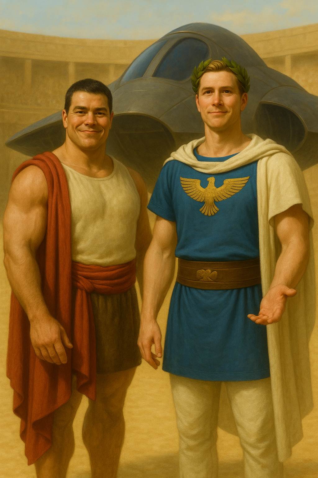 Но всё прошло спокойно. Высадились на песке арены, где их встречала целая делегация и сами примархи. Братья выглядели контрастно — один высокий и жилистый, а другой ниже, но гораздо шире и массивнее, кряжистее. Оба были одеты в парадные одежды, броню они не надевали. Они были рады проделанной работе и радостно приветствовали своего отца и Императора.