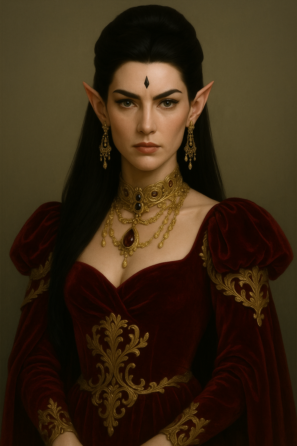 Высокая, статная женщина спускалась по ней. Чёрное бархатное платье с золотым шитьём сидело на ней словно вторая кожа, нисколько не стесняя движений, наоборот, подчёркивая изгибы фигуры, её плавность и грацию. Часть волос была собрана в высокий пучок, в то время как остальные ниспадали тёмными локонами за спиной и плечами женщины. Изящное золотое ожерелье обнимало её стройную шею, плавно опускаясь к груди. Но больше всего выделялись длинные заострённые уши с тяжёлыми серьгами из того же комплекта и несколько отличное от человеческого узкое лицо.