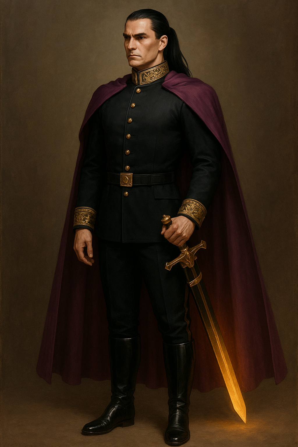 Высокий, атлетично сложенный, длинные волосы цвета обсидиана убраны в тугой хвост, а лицо гладко выбрито. Чёрный военный мундир с золотыми пуговицами был подогнан идеально по фигуре, а золотая вышивка обрамляла воротник и манжеты. Чёрные брюки с золотой кантовой полосой заправлены в высокие, доходящие чуть ниже колен, кожаные черные лакированные сапоги. Поверх на плечи был накинут пурпурный плащ, а на золотой перевязи у пояса был заметен массивный меч, заправленный в ножны, от которого исходил внутренний свет.