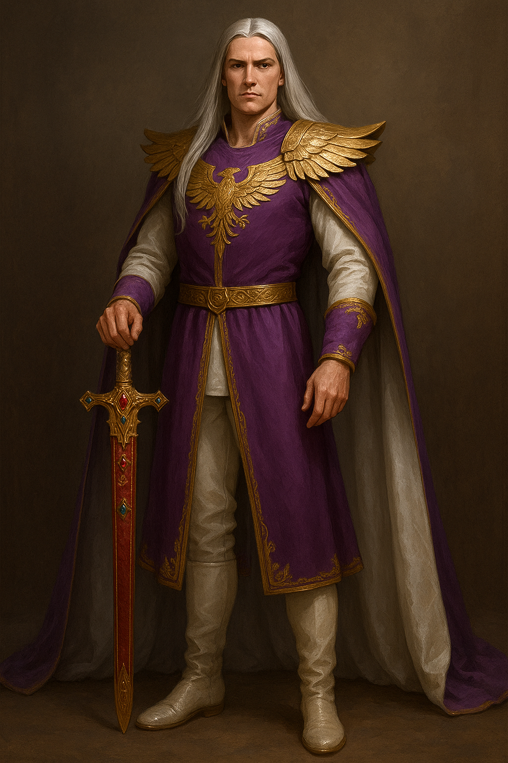 Сам примарх был облачён в белую шёлковую тунику, лёгкую, словно пёрышко. Поверх неё — пурпурный длинный камзол с золотой вышивкой на груди в виде птицы, крылья которой переходили в золотые наплечники в виде крыльев, каждое из которых было выгравировано с особым тщанием, казалось, что феникс вот вот полетит. Под наплечниками тяжёлый сиреневый плащ с белым подбоем ниспадал с его плеч, переливаясь блеском. Длинные, до лопаток, платиново-серебряные волосы распущены, идеально прямые, словно струи ртути. На ногах у него были белые слегка зауженные брюки с золотой отделкой по бокам и высокие до голени ботинки из мягкой кожи завершали образ. На поясе в богато инкрустированных драгоценными камнями ножнах покоился выкованный лично примархом меч, что был наречён им Глориана.