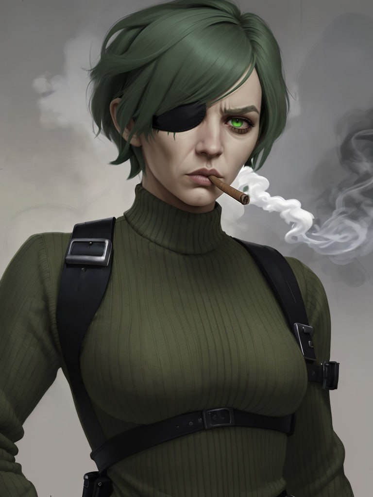 Ведь вот вроде и фигура у неё была просто огонь — подтянутая, статная, с военной выправкой, так ещё и весьма пышная в районе своих верхних достоинств, но… Но при этом эта фигура абсолютно всегда затянута в невзрачные одежды — зачастую военного образца. Собственно, как сейчас — высокие чёрные сапоги, болотного цвета штаны и столь же болотного цвета свитер, поверх которого нынче имелась портупея с кобурой для пистолета и креплениями для кастетов. Да и лицо у женщины, что обрамляли её короткие волосы типичного для рода Хили оттенка, ведь тоже было вполне себе ничего так, хоть и пошла она не в мать, а скорее в отца, из-за чего, то было не округлым, а немного вытянутым и худощавым, что его совсем не портило. Как и нельзя сказать, что лицо данной курильщицы портила бледность — или даже извечная сигара во рту! Хоть и не без этого… Да и закрытый специальной вкладкой правый глаз, из-под которой виднелись зеленоватые прожилки на коже — может, и можно было назвать недостатком, но… Но — нет, всю картину напрочь убивало всё же извечно хмурое выражение этого самого лица, а также взгляд из рубрики: лечу запор одной лишь тяжестью своего недовольного взора! Из-за чего Эльвира Хили в частности даже выглядела значительно старше своего реального возраста лет эдак на десять.