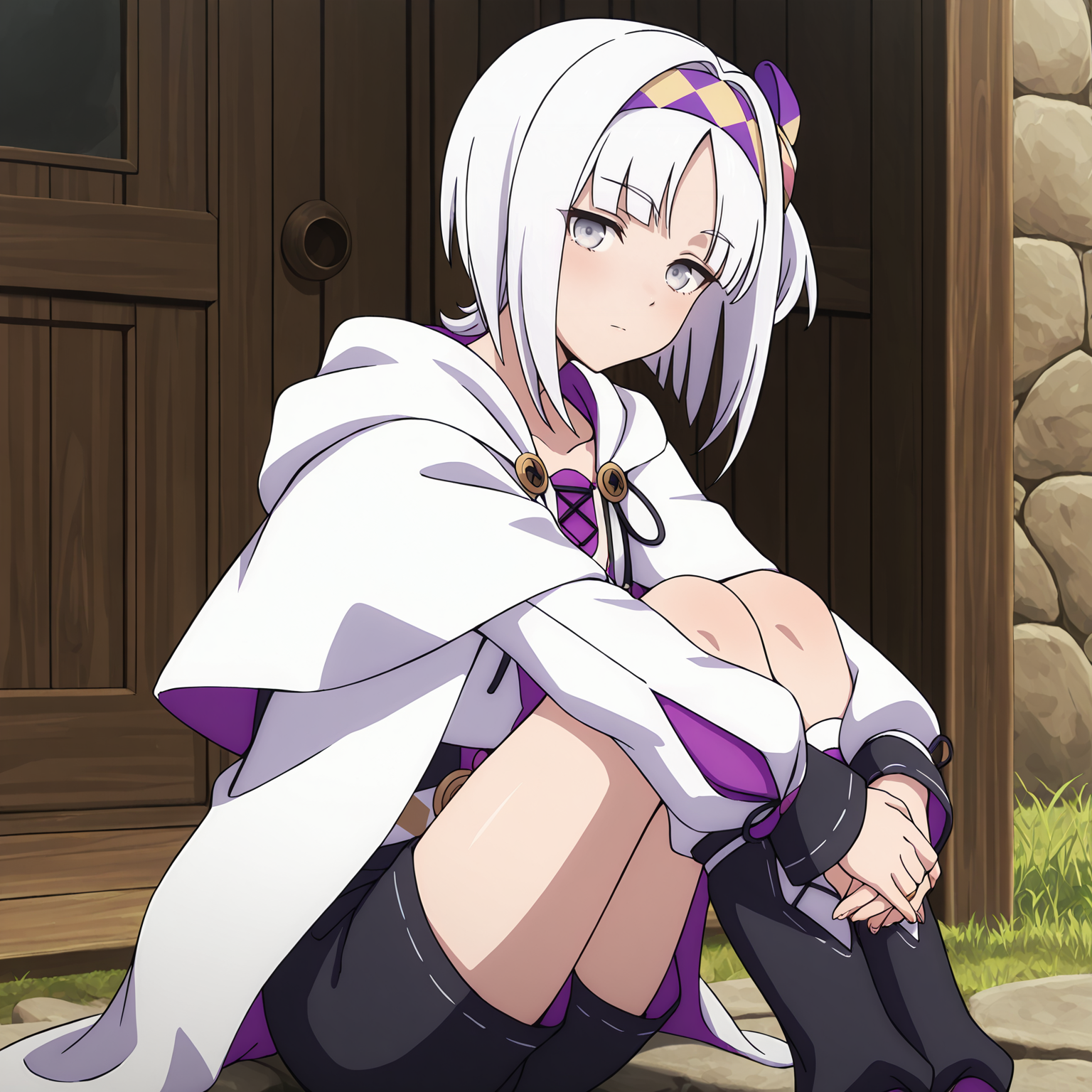 В качестве одежды на ней была чистая белая накидка, держащаяся на двух больших пуговицах, а передние вставные части накидки были скреплены меж собой чёрными шнурками. Под накидкой — тёмно-фиолетовое платье, плотно облегающее её миниатюрную фигурку. С длинными, пришитыми широкими рукавами от локтей. На талии платье опоясывалось ещё одной лентой в точно таком же стиле, что и в волосах.
