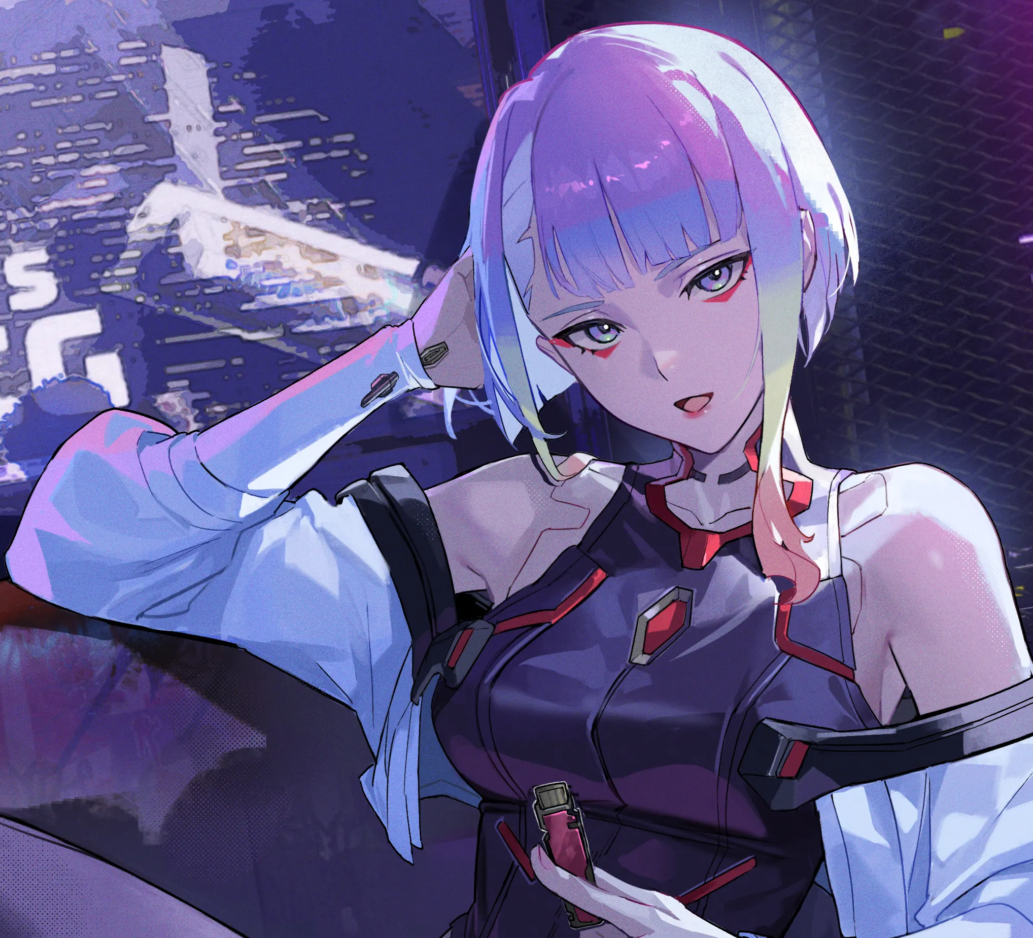 Так как всё это время моя собеседница бесстыже меня рассматривала, я решил ответить ей тем же и пробежался взглядом по её невысокой фигуре. Лет 18-19 на вид. Круглое лицо, мягкие черты лица, белоснежная кожа с едва заметным синеватым оттенком, пара розовых татушек, яркие зелёные волосы, завязанные в два хвоста до плеча. Глаза трёхцветные: красная склера, зелёная радужка и большие фиолетовые зрачки. А вот одежда моей новой знакомой разнообразием отнюдь не блистала, скорее с точностью, да наоборот. На ней было исключительно тренировочное нижнее бельё, да накинутая поверх этого куртка, распахнутая на груди и доходящая лишь чуть ниже талии.