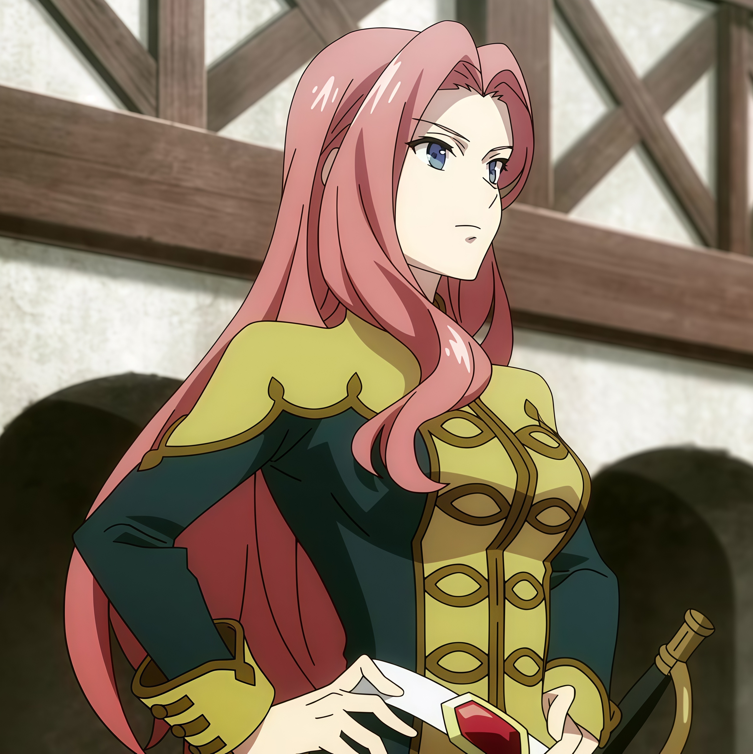 Одежда, что называется, парадная. Зелёный приталенный мундир с длинными рукавами, украшенный вставкой из ткани благородного золотого оттенка. И притален настолько, что, как и говорилось, очень ярко демонстрирует все изгибы, а именно объёмную подтянутую грудь и тонкую талию.