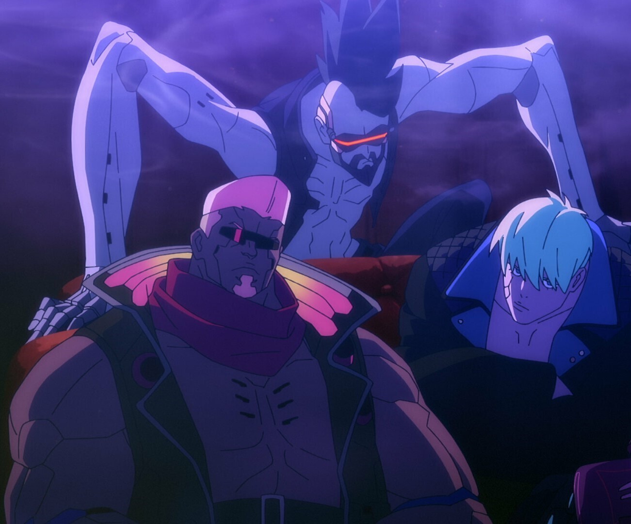 Внутри, как и показывал сканер, находилось трое — по-настоящему крупный, если не сказать огромный, мужик в тёмных очках (внушительных размеров кибер-ноги, здоровенные толстые кибер-руки, куча хрома в теле), суровая короткостриженая девушка ему под стать (тот же набор железяк, но размерчики чуть поскромнее), а также тощий «рокер» с высоченным ирокезом, моно-визором вместе глаз и небольшим количеством имплантов, включающим лишь подкожную броню, пару внутренних органов, да неестественно длинные руки…