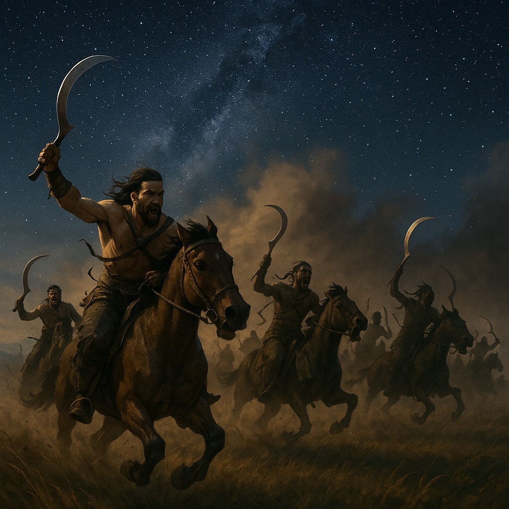 На равнинах за Миэрином, под звёздным небом, мы мчались к точке встречи с основным отрядом. Ветер хлестал по лицу, неся с собой запах пыли и свободы. Но наш путь не был безопасным. На горизонте появилась туча пыли, и я увидел силуэты дотракийских всадников. Их аракхи сверкали, а боевые кличи разрезали ночь.
