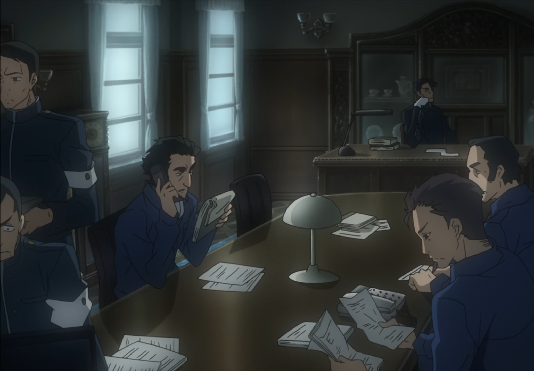 Просторный кабинет, с длинным центральным столом, вокруг которого суетились люди — одни говорили по телефону, другие что-то обсуждали в наушниках. В дальнем углу за массивным столом сидел угрюмый мужчина, его густые брови сдвинуты, пока он изучал стопку документов. Позади него, в изысканном платье, элегантно стояла его супруга.