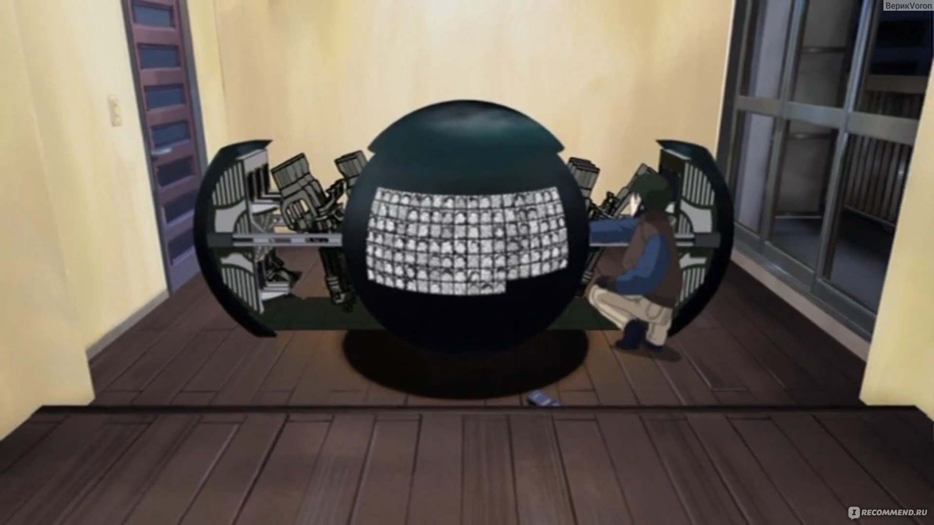 минималистичный японский интерьер с панорамными окнами, за которыми раскинулся ночной Токио. И футуристичная чёрная сфера в центре помещения…