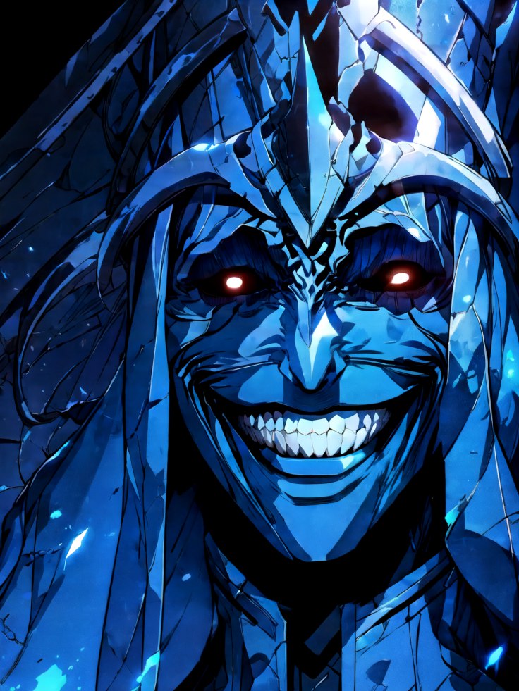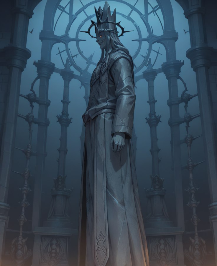 Холодный синий свет, казалось, исходил из самих стен и факелов, придавая всему нереальный, потусторонний вид. В этом призрачном сиянии четыре величественные фигуры восседали на своих тронах, внушая трепет и благоговейный ужас, выступая в роли не посланников бога, а прямым воплощением богов смерти.