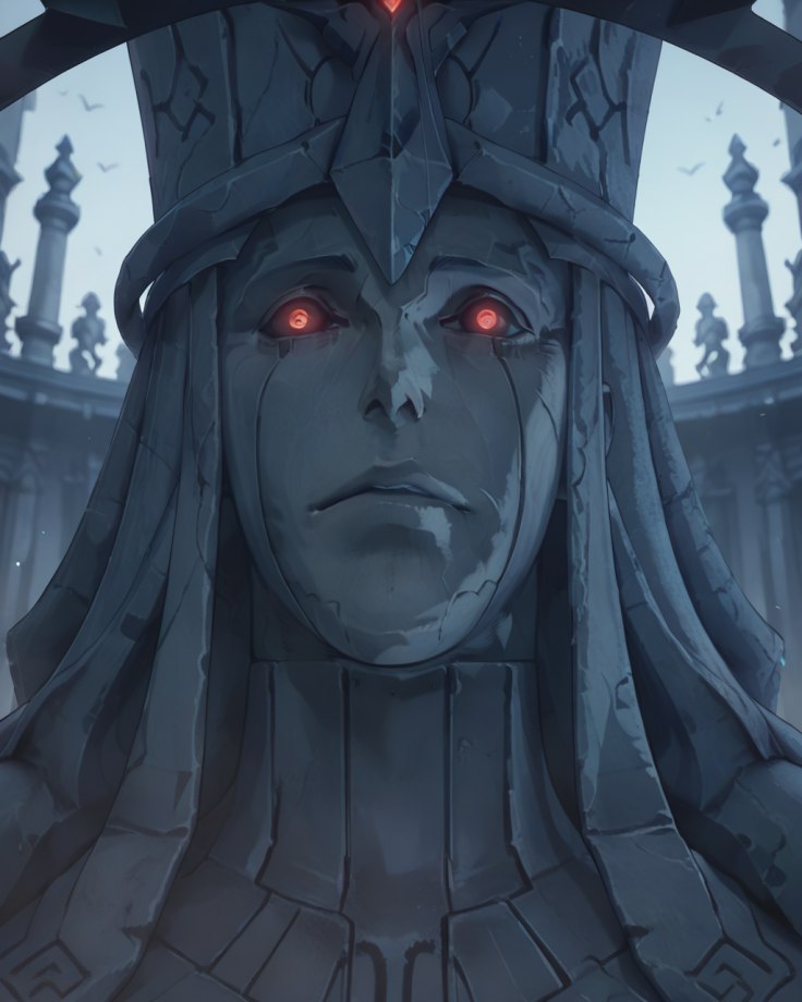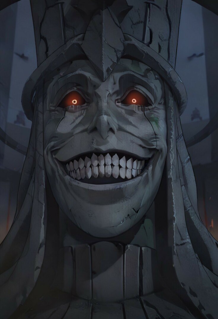 Каменное лицо статуй было искажено в зловещей ухмылке. Глубоко посаженные глаза светились неестественным светом, словно заглядывая прямо в душу.