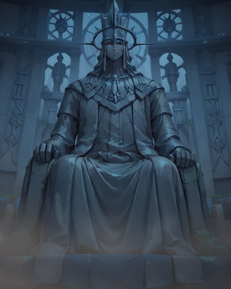 Статуи были высеченные из разного камня, возвышаясь безмолвными стражами, их пустые глазницы, казалось, следили за каждым движением. Тени от их величественных силуэтов причудливо танцевали в мерцающем синем свете, создавая иллюзию едва уловимого движения, давая ощущение того, что вот-вот и они встанут.