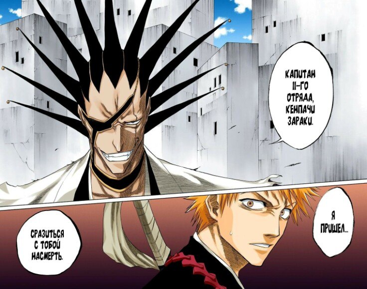 — Отлично! Я Капитан Одиннадцатого Отряда, Зараки Кенпачи, — воскликнул он, взмахнув клином. — Я пришёл сразиться с тобой. Насмерть.