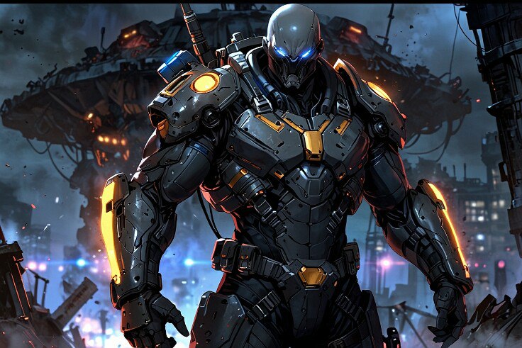 Облачение гиганта вызывало отдельное изумление. Оно навевало мысли о высокотехнологичной защитной одежде. Чёрный обтягивающий комбинезон из плотной ткани. Поверх него щитки на локтях и коленях. На туловище надето подобие бронежилета с подвесами. На поясе справа у него висел футуристический пистолет, а справа боевой нож, который размерами способен посоперничать с коротким мечом. Впрочем, с его габаритами клинок не казался таким уж большим.
