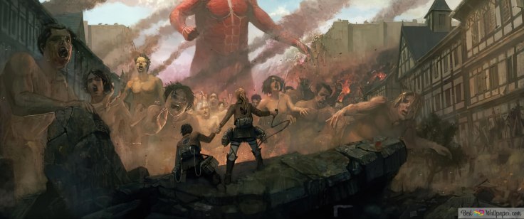 Секунду спустя чудовищный грохот разнёсся по городу вместе с осколками от внешних врат Шиганшины. Крики ужаса заполнили улицы. Звон упавшего колокола ознаменовал о конце времён. Не прошло и минуты как титаны показались из образовавшейся в стене дыры. Многометровые чудовища похожие на людей полностью лишённые первично половых признаков. Титаны возвышались над зданиями спокойно шагая по улицам города и выискивая людей. Тем кто попадался им в руки ждала печальная участь быть сведенным.