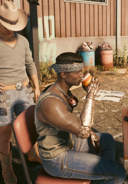 — Честно говоря, планирую побыстрее слинять и добраться до Найт-Сити… не знаете можно тут найти надёжного водилу, который не решит ёбнуть меня по дороге и сможет провезти за стену без прохождения сканирования на границе?