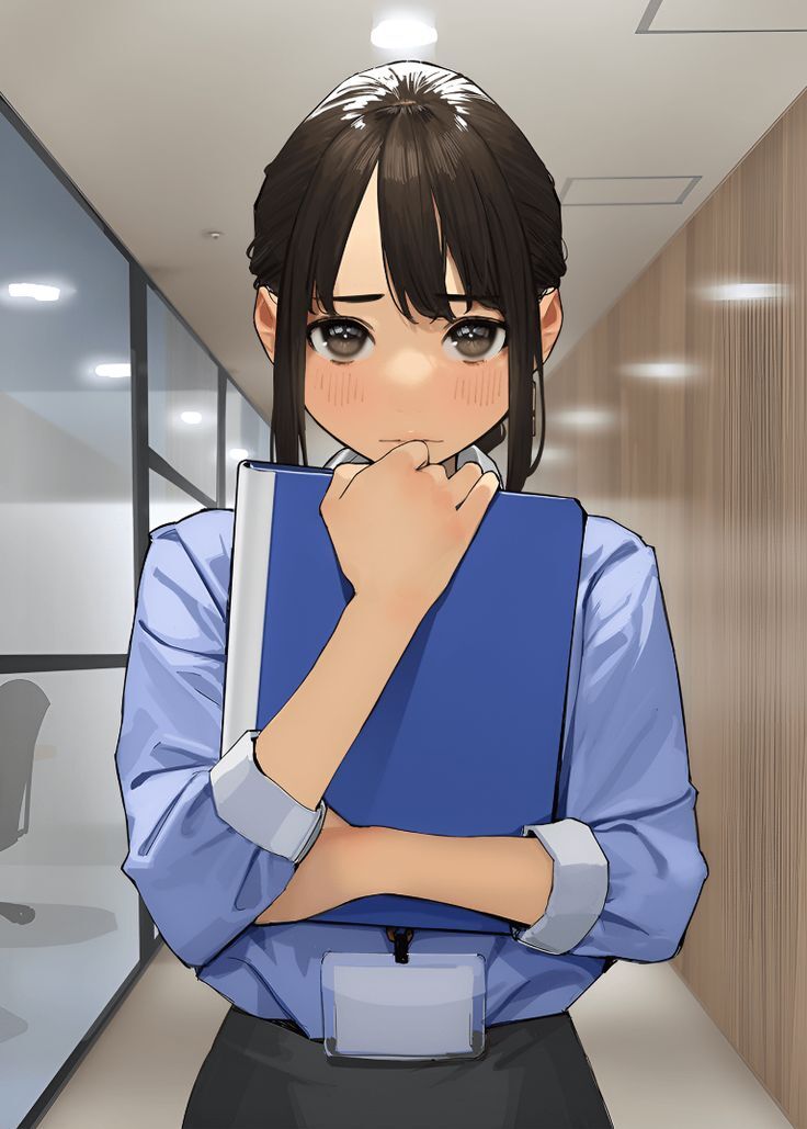 Выглядела Хиэда, в общем, вполне симпатично, милое личико, стройные ножки в колготках, строгая юбка почти до колен, но, всё же, выше, и рубашка на пуговицах. В целом, деловой офисный стиль, и миниатюрная фигура со смазливой мордашкой, делающие младшего редактора большей похожей на подростка. Возможно, если нарядить её в школьную форму или какой-нибудь молодёжный наряд, она и правда сойдёт за настоящую школьницу. Но, в офисном костюме, в общем-то, видно, что Хиэда это молодая девушка, а не девочка-подросток.