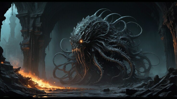 Перед ним открывалась ещё одна пещера, но на этот раз её стены пульсировали, будто они были живыми. А в центре, на полу, лежало ОНО. Массивное, бесформенное, похожее на гигантскую червивую массу, покрытую щупальцами и ртами. Десятки ртов. Они шевелились, чавкали, скрипели зубами, слизывая что-то с камней.