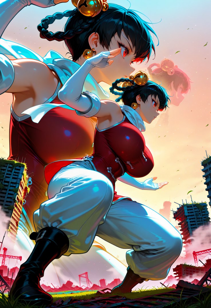 Встретившись взглядом с Лин Лин, он полетел к ней. Она попыталась контратаковать, нога взметнулась в мощном ударе, свистя в воздухе вместе с колокольчиками на голове, но он легко уклонился, тело на автомате изогнулось с грацией водного потока. В следующий миг его пальцы сомкнулись на её горле, крепко, но не смертельно. С рывком, он унёс её ввысь, пока ветер ревел в ушах, а земля стремительно удалялась.