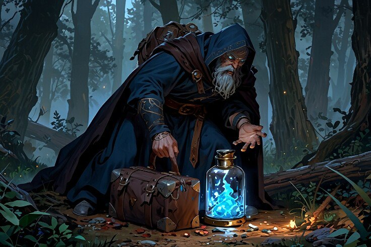 Флакон был небольшим, из тёмного стекла, плотно закупоренным пробкой из особой породы древесины, которая похожа на пробковое дерево. Внутри плескалась густая чёрная жидкость, которая даже сквозь стекло казалась неестественно живой. От неё исходил лёгкий, но ощутимый вибрацией в воздухе гул — словно далёкий рокот подземного толчка.